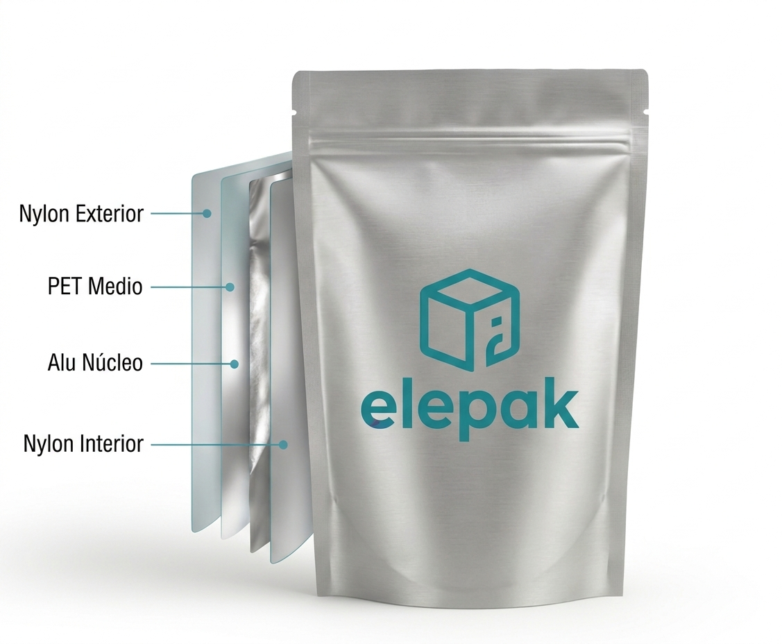 Esta estructura de material cuádruple ofrece la máxima protección posible. El Nylon exterior y Nylon interior proporcionan una resistencia mecánica excepcional contra perforaciones y rasgaduras, mientras que el Aluminio central crea una barrera impenetrable al oxígeno, la luz y la humedad.
